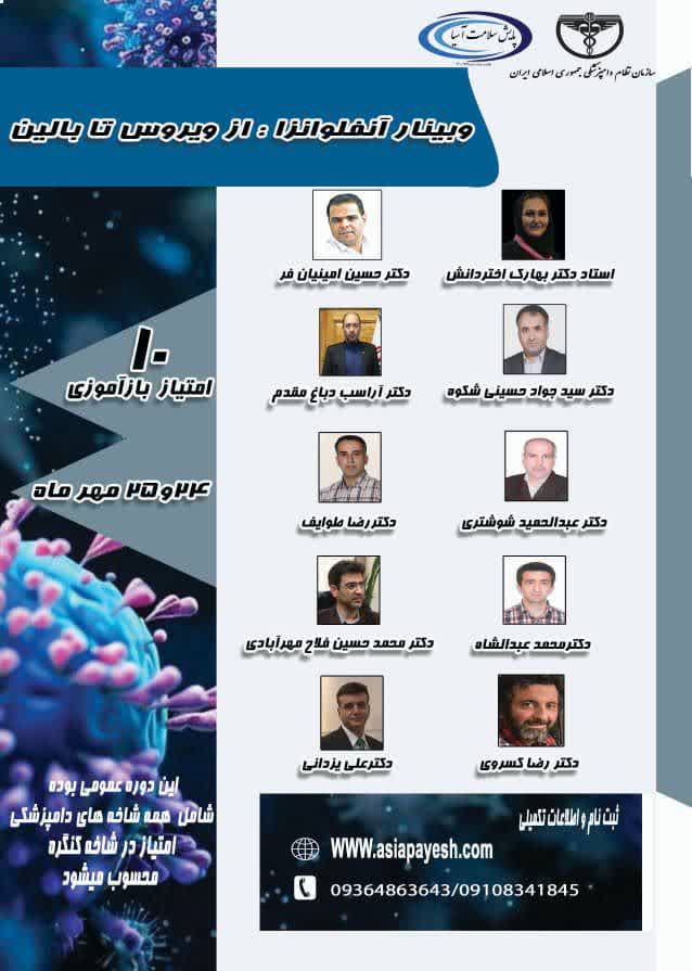 شرکت پایش سلامت آسیا با همکاری سازمان نظام دامپزشکی جمهوری اسلامی ایران، در تاریخ ۲۴ و ۲۵ مهرماه، وبینار علمی–تخصصی آنفلوانزا را با امتیاز بازآموزی ویژه برای دامپزشکان کشور برگزار مینماید. این رویداد تخصصی با حضور جمعی از اساتید بنام دانشگاهی و متخصصان حوزه اپیدمیولوژی، بهداشت عمومی، بیماریهای ویروسی و داروسازی برگزار خواهد شد.